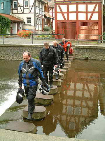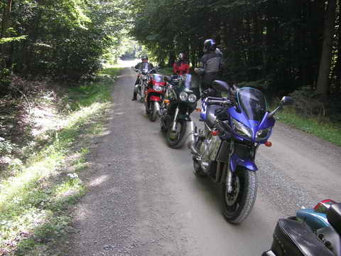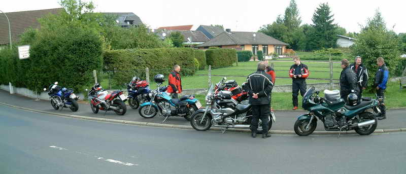2. Tourtag: Morgens um 8:02 Uhr bekomme ich eine SMS von unserem Nachzügler. Er macht sich jetzt auf in den Regen. Na dann erst mal unter die Dusche, bis der aus Dinslaken die rund 300 km gefahren ist haben wir noch Zeit zum Treffpunkt zu fahren. Während des Frühstücks entscheiden wir uns zu einem Motorrad Bekleidungsladen zu fahren und uns dort mit neuen Handschuhen und dichten Überhandschuhen einzudecken. Im Hotel weist man uns den Weg zu einem nahe gelegenen Laden. Um 10:00 Uhr fahren wir los. Wir kommen gerade die drei km bis Freiensteinau, da geht mein Handy. Der Nachzügler befindet sich 12km vor unserem Treffpunkt! Mann, da hat der aber Gas gegeben (ab Dortmund trocken!)! Also neuen Treffpunkt Eichelsachsen ausgemacht und ersteinmal die Gruppe vervollständigen. In Eichelsachsen angekommen ist keiner zu sehen, also Handy raus und - kein Netz! Grummel grummel, was tun? Wir entschließen uns einen Ort weiter zu fahren. In Rainrod dann wieder Handy raus und - super, wieder ein Netz, Nummer gewählt - .....Sie sind verbunden mit der mailbox von... Arrgrgg, nochmal gewählt..... sie sind verbunden mit der..... Ok, also eine SMS geschrieben und abwarten. Kurz danach ruft A. aus D. an, sollten wir uns doch noch finden? Jepp, nach kurzer Wartezeit kommt die Kawasaki die Straße entlang. Wir haben uns im kleinen Ort Eichelsachsen wohl verfehlt (eigentlich hätte er die Shadow ja hören müssen).