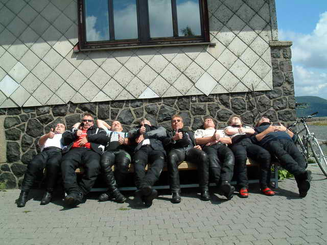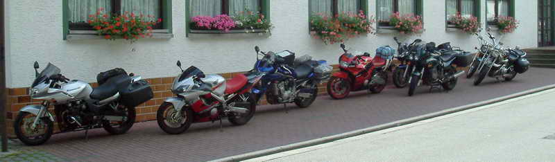 1. Tourtag: Um 14:00 Uhr soll Abfahrt sein. Wir treffen uns bei mir zu Hause. Ich habe mir nach der Nachtschicht den Wecker auf 12:00 Uhr gestellt. Mein erster Blick nach dem Aufstehen geht Richtung Himmel. Aaaah, es ist trocken, super! 13:30 Uhr, der erste Tourfahrer trifft ein, es ist noch immer trocken. 14:00 Uhr, die Letzten treffen ein, es beginnt zu regnen. Bis 14:30 Uhr stehen wir im Hausflur und sehen dem Regen zu. Dann der Entschluss: Regensachen anziehen und los, ab durch den Regen! Erste Pause Rasthof Siegerland. Der Regen hört auf und die Sonne blinzelt durch die Wolken. Die Stimmung ist ist noch recht gut, Thema ist natürlich nur das Wetter. Ok, Pause zu Ende, es geht weiter. Wieder auf die Autobahn - es fängt an zu regnen. Bei Wetzlar bekommen wir dann TOP- Zuschlag. Wir fahren mit max. 60 km/h in eine Weltuntergangsstimmung aus dunkelsten Wolken mit viel Wasser um uns herum und überlegen, ob die Fahrt ohne Sauerstoffgeräte zu überleben ist. Ich halte Ausschau nach einer Ausfahrt, an der man sich nach der Abfahrt unter eine Autobahnbrücke stellen kann - Fehlanzeige! Alle Straßen führen über die Autobahn! Also durch bis zur Abfahrt 37 (Wölfersheim). Ab hier hört es tatsächlich auf zu Regnen. Die ersten undichten Stiefel und vollgesaugten Handschuhe sind zu beklagen. Ich ärgere mich wahnsinnig darüber mein Pinlock- Visier daheim gelassen zu haben. Die letzten km bis zum Hotel fahren wir dann zwar über nasse Straßen aber ohne Regen. 19:00 Uhr, am Hotel ist alles trocken und die verdutzten Blicke vom Chef verbunden mit der Frage:"Oh, seid ihr nass geworden?" zeigen, dass es hier wohl nicht geregnet hat.